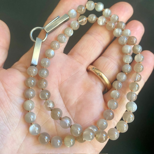 The necklace is strung on warm ocher silk
